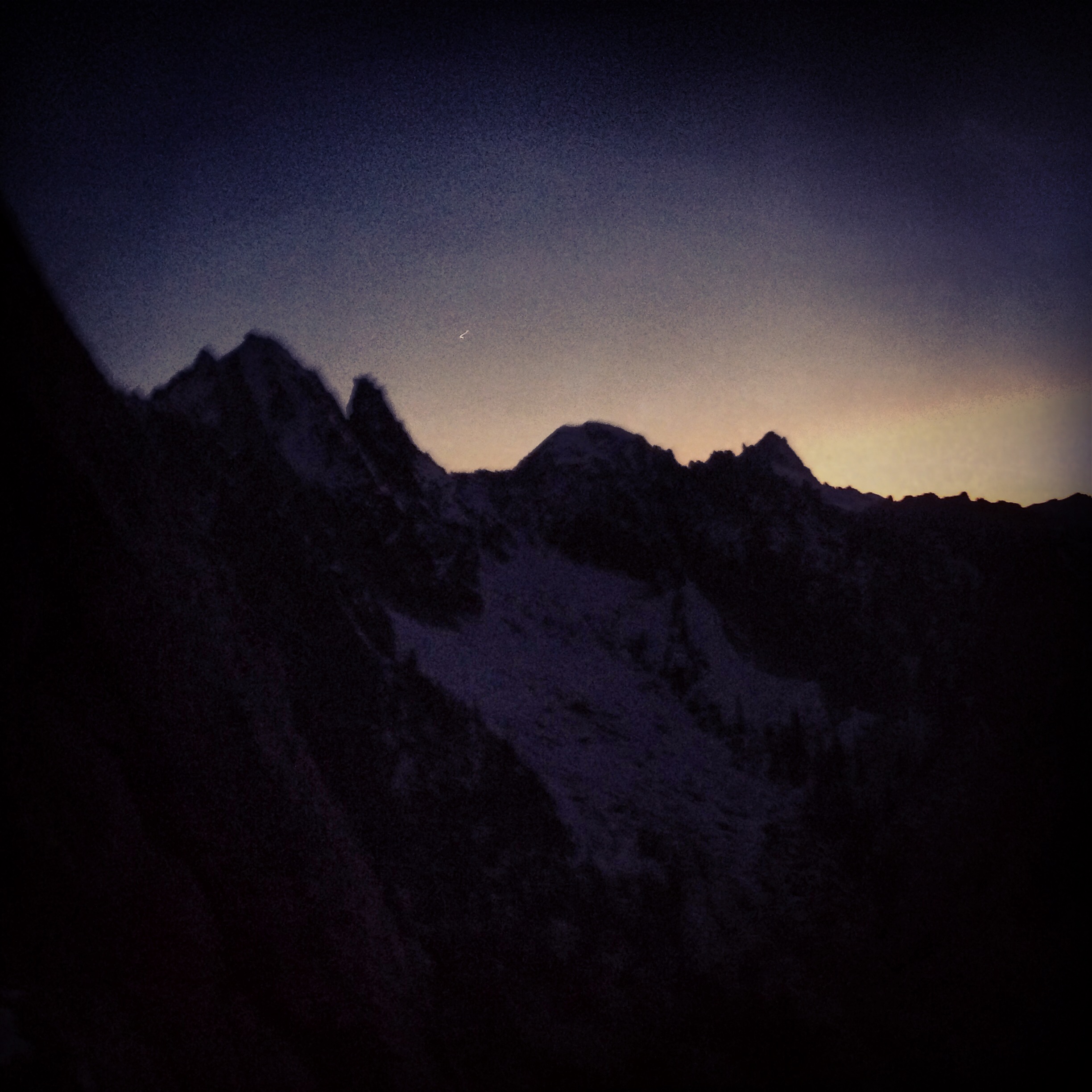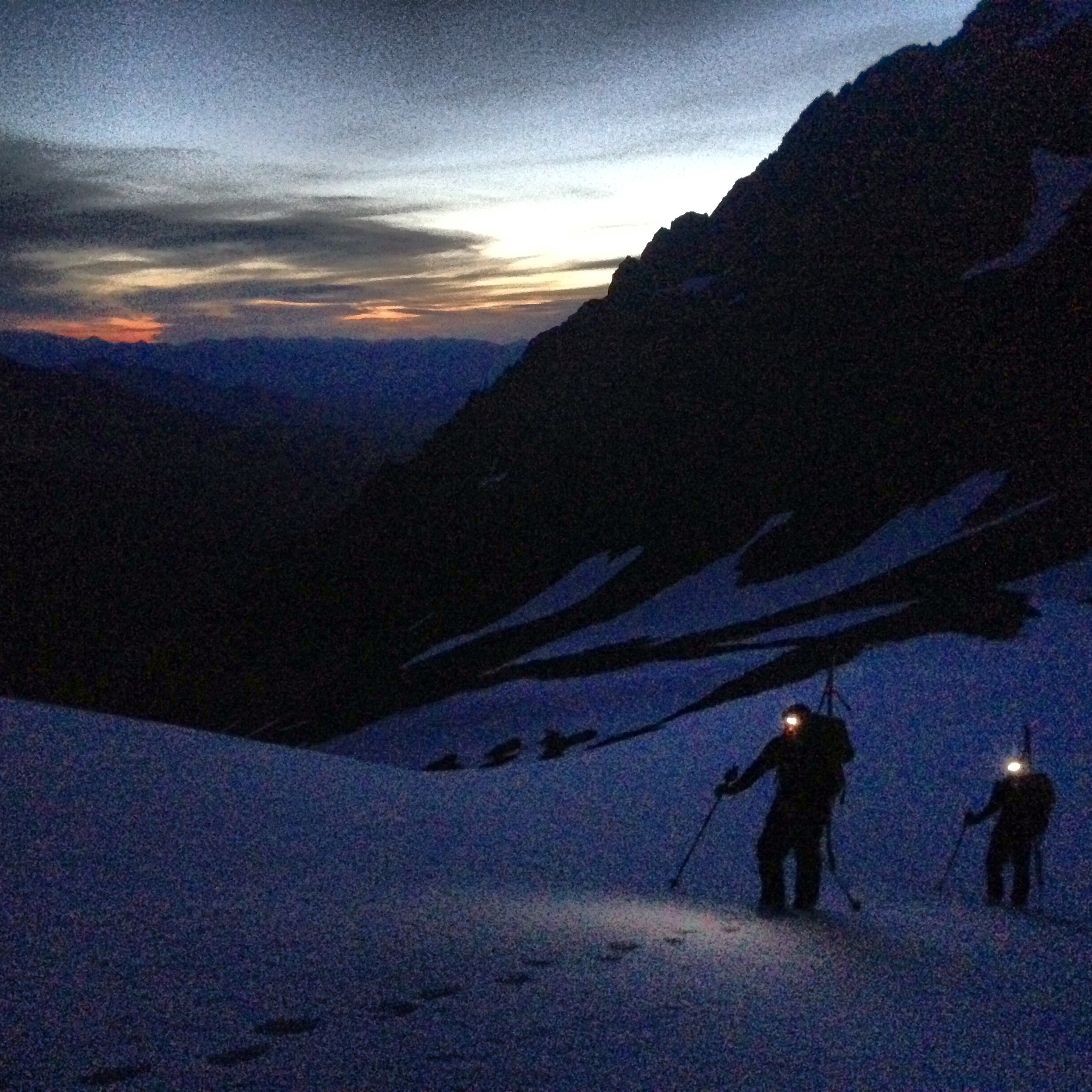 This brief moment of calm ended quickly when I scrambled up another 20 feet to look for the route to the descent gully. Glowing in the twilight, I discovered a beautiful but dangerous scene. In summer months this 4th class slope of rocks and slabs would easily be crossable in the dark. Now it was covered in 2 feet of snow, with our vision limited to the 20-foot beam of our headlamps. It seemed impossible. We spent 20 minutes scrambling around, looking up, looking down, looking for any way to safely make the crossing. I looked at my brother and said, “I think we’re bivying tonight.” Glad to have packed an emergency bivy sack and regretting my decision to keep our packs light by not bringing a sleeping bag, I looked for a spot to hunker down.