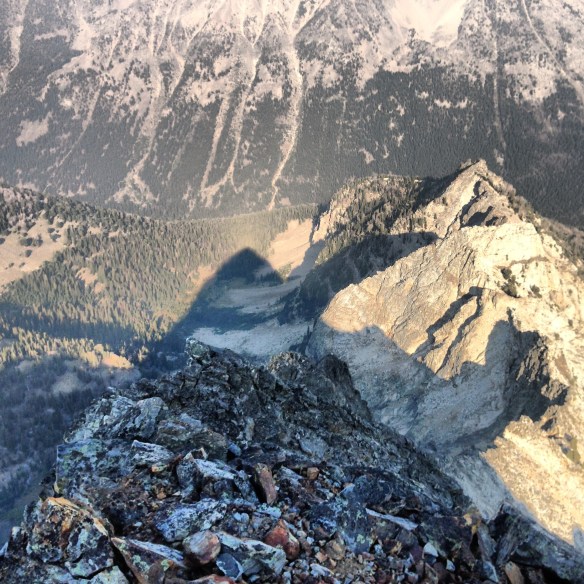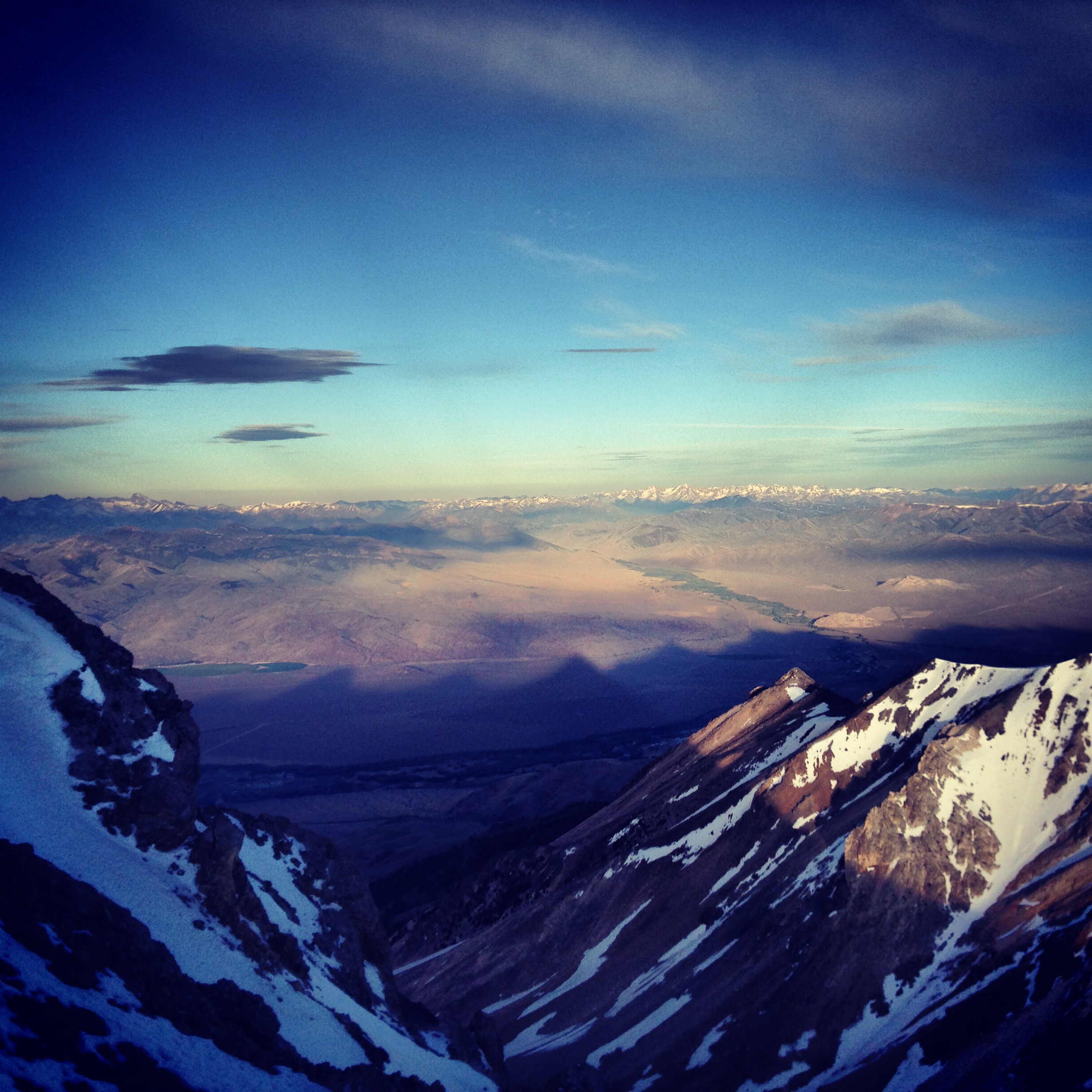We continued on in great climbing conditions, without the need for even a single axe, occasionally climbing over small rock sections. At 645, we reached the small summit, excited to be somewhere so cool so early in the morning! With a slight wind, the summit was just a little chilly as the sun’s pace of rising seemed to slow. Because of the size of the range compared to the desert 6000′ below, a tremendous shadow of the mountain projects halfway across the valley below, creating one of the most magnificent vistas I have ever seen.