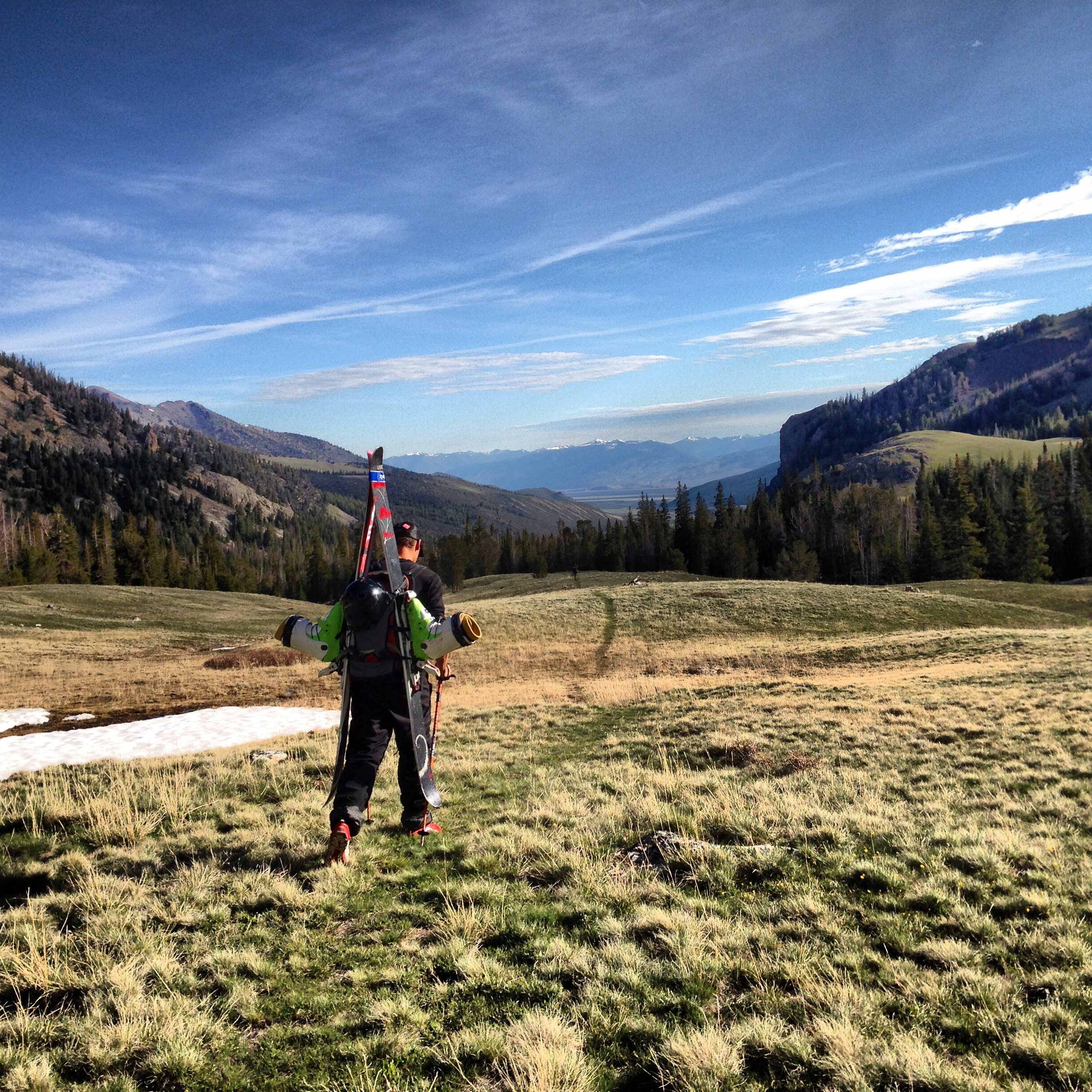 The snow was good. We all agreed it was like a slightly icy Baldy groomer, which is better than it sounds. We all skied pretty high-speed almost non-stop, regrouping a couple times on the way down to give each other super stoked high fives. After skiing 3000′ to the meadow below, we put our shoes back on, strapped the skis back to the packs, and hiked slash jogged back to camp, arriving at 10am.