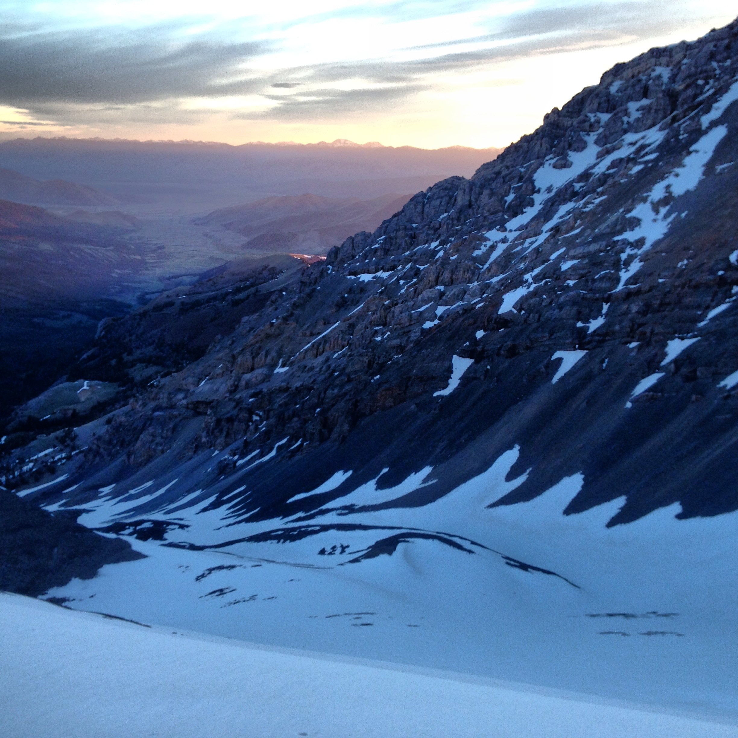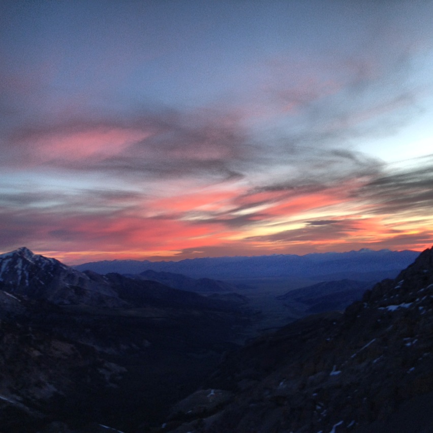Still in total darkness, we began climbing up steep snow and rock with our headlamps on (only later, on the way back down, did we realize that we took an overly difficult route up this bottom section). I was feeling very strong, and we made good time as we progressed up the climber’s right side of the northeast face. Eventually, we gained the ridge, giving us a breathtaking view of neighboring White Cap peak basking in the golden morning sun. The views from this point on were absolutely spectacular as we watched the sun rise over the mountains and valleys behind us while the desert to the immediate west of the range was still dark in the shadows of the early morning hours.