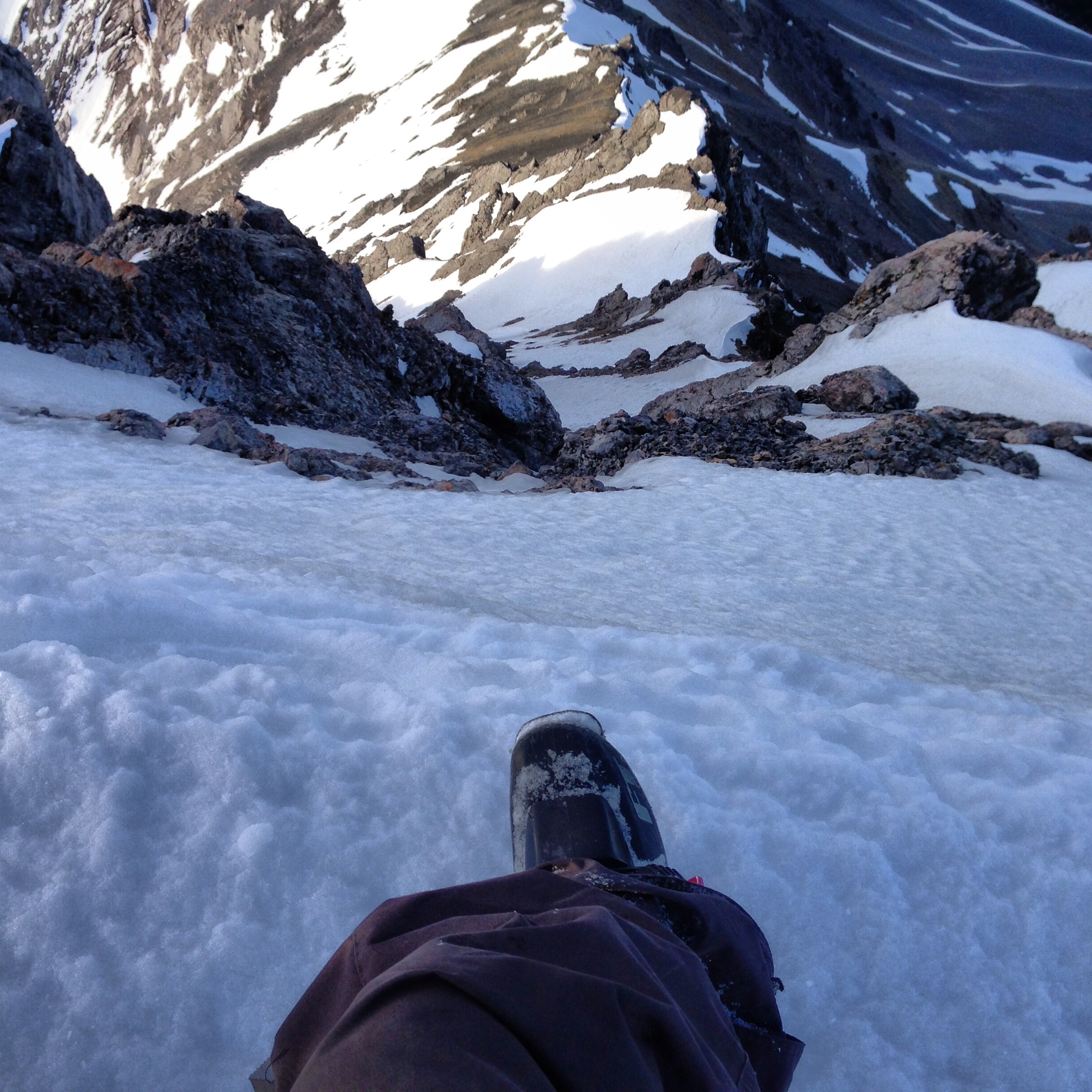We made it about a third of the way up the couloir in a running belay and started to notice more and more small snow and rock debris coming down the couloir. The snow was still solid in the shady couloir but the sunlight outside the walls was hot. Just as we were discussing whether to continue up or retreat based on our late start and lack of clear descent route, a basketball-sized rock came barreling off the cliffs above and landed in the snow about 20 feet behind us, where we had just been climbing through. We decided that rockfall hazard was increasing quickly with the heat and that a fast retreat was probably our best option.