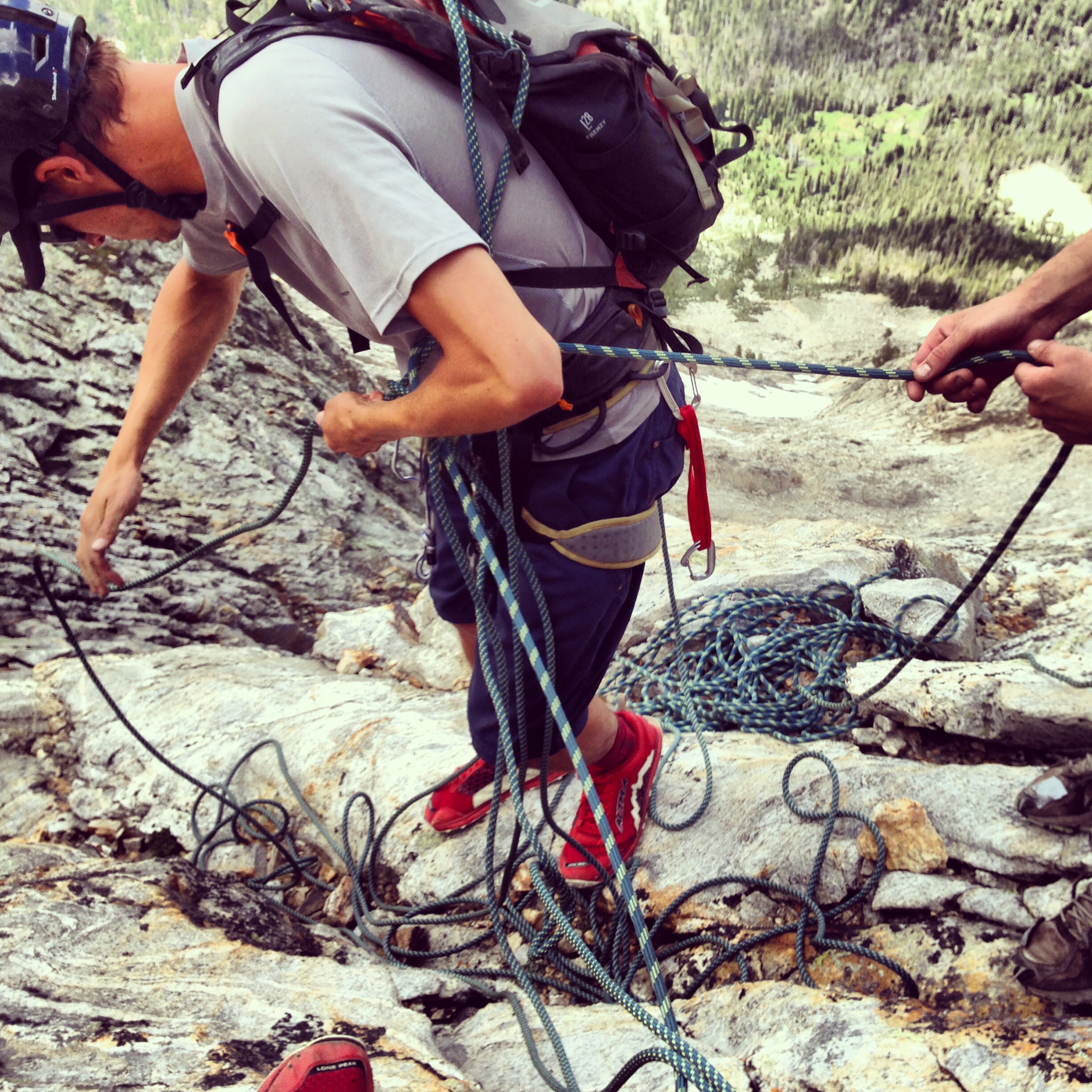 Here I am trying to untangle our mess of ropes at the top of pitch 2.