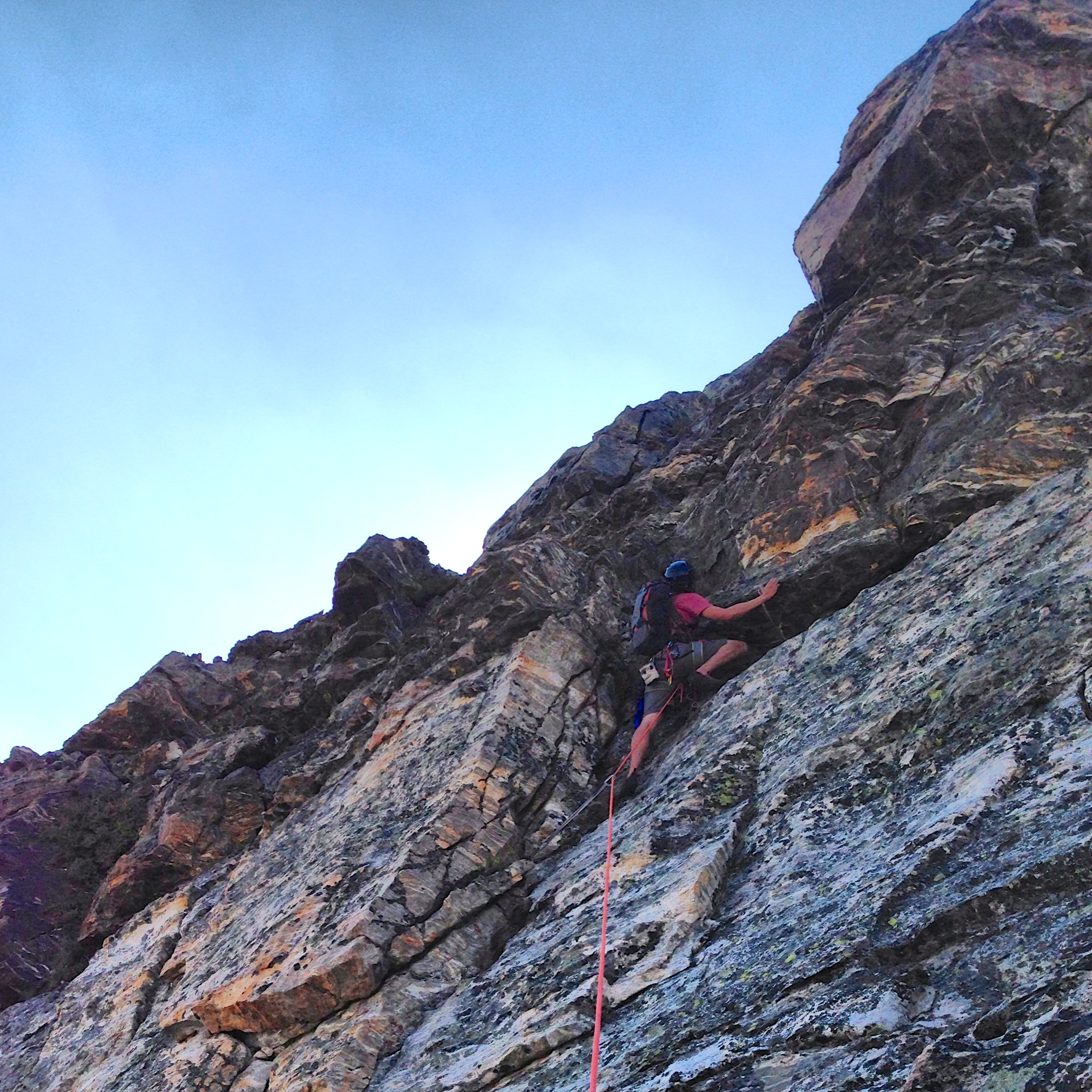 The route is beautiful. The exposure once on the arête is captivating. Throughout most of the route, the rock was good quality, and protection was easy to find and place. As expected on any alpine climb, loose blocks were encountered, but the route was stable for the most part.
