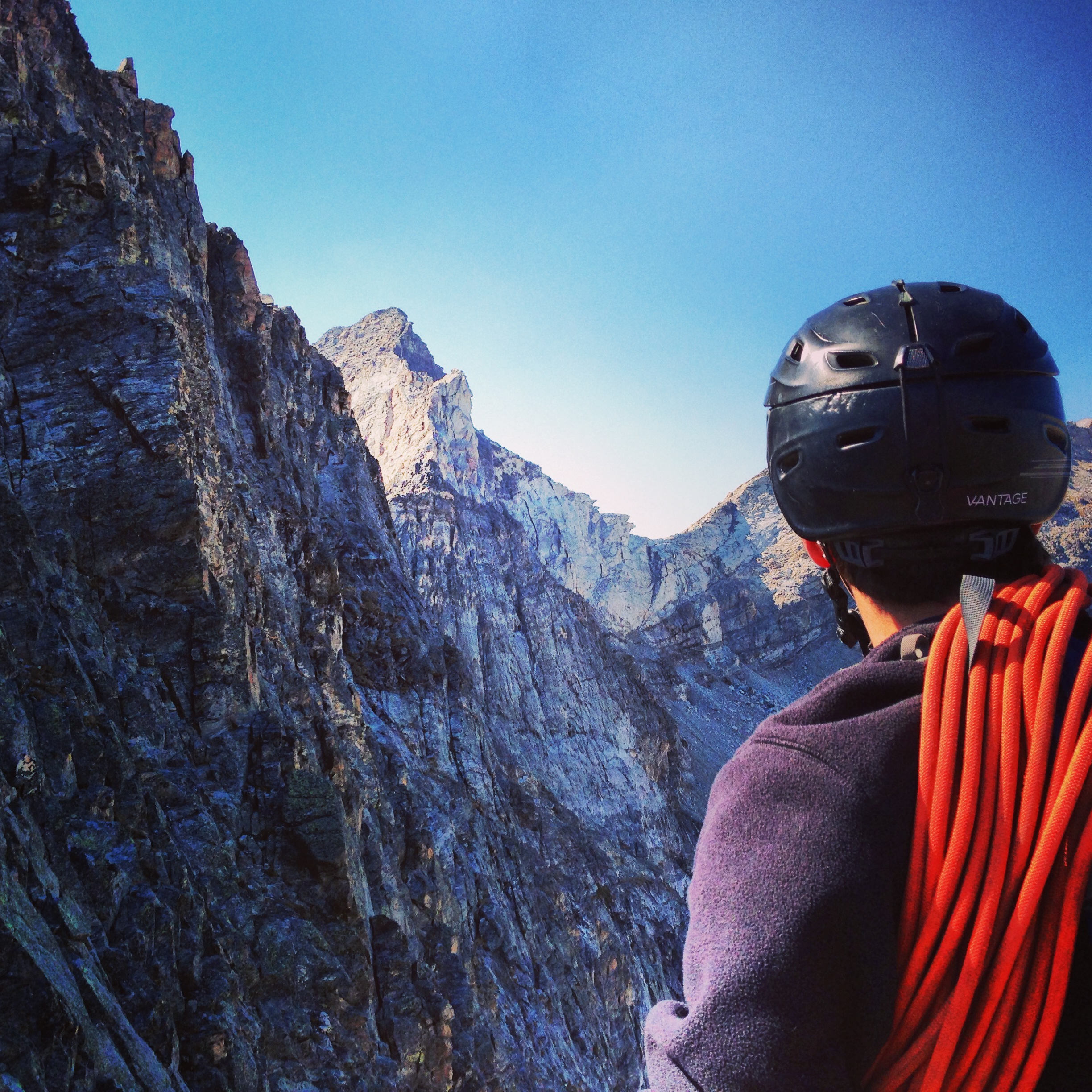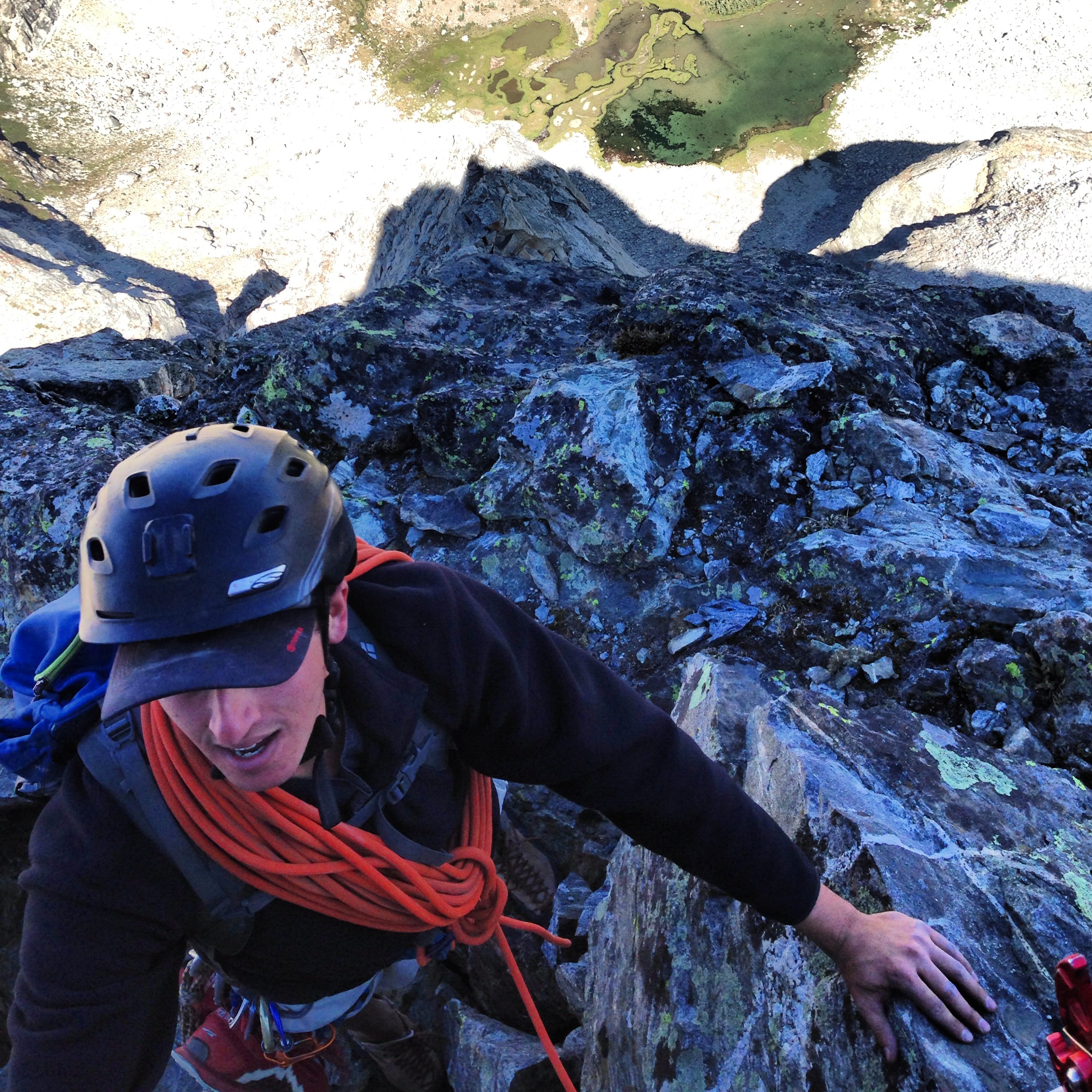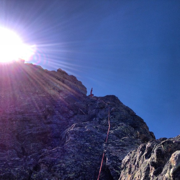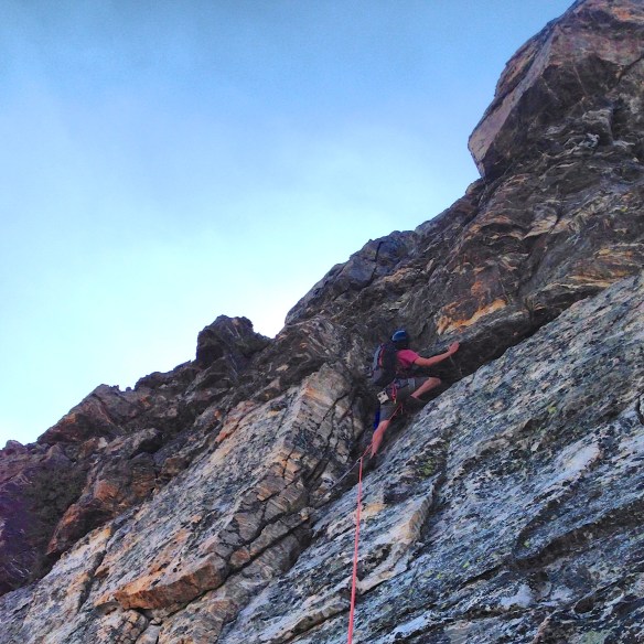 There are multiple options for gaining the arête. We followed the obvious left-facing couloir (which was snow-free) about halfway up and started climbing from there. We found this first move to be one of the more difficult on the climb, and ran out almost an entire pitch on one cam, although it was easy fifth class other than one 5.7 move right off the bat. I’m sure an easier option existed.