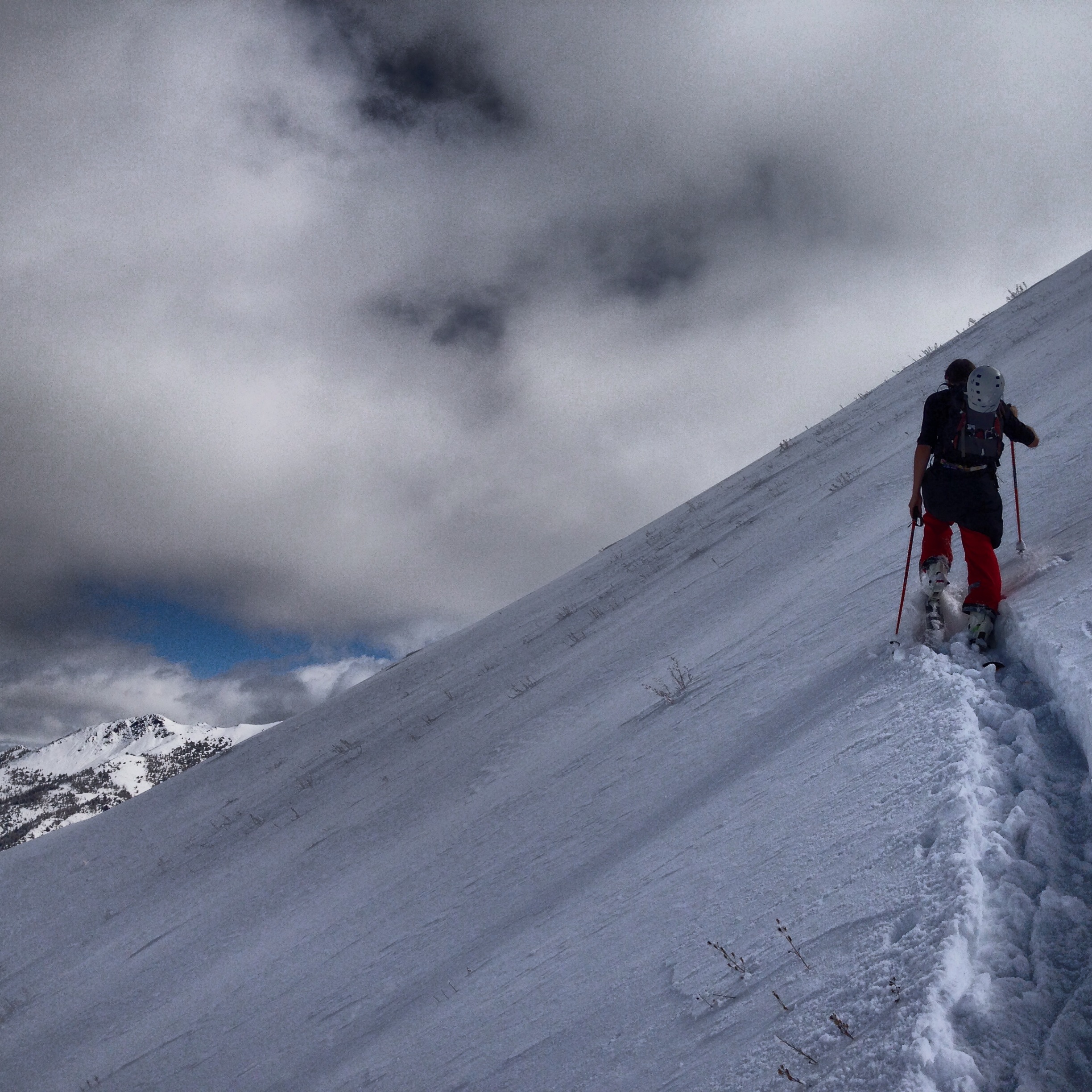 Usually we just boot-pack up this line, but this time we were able to skin up to a couple hundred feet below the summit, where we then dropped our gear and scrambled to the top. The scenery from the summit is unreal – a 360 degree view of the entire Pioneer range, with the Lost Rivers and Boulders looming in the distance. The summit provides one of the best views of my favorite mountain in the range – the Devil’s Bedstead.
