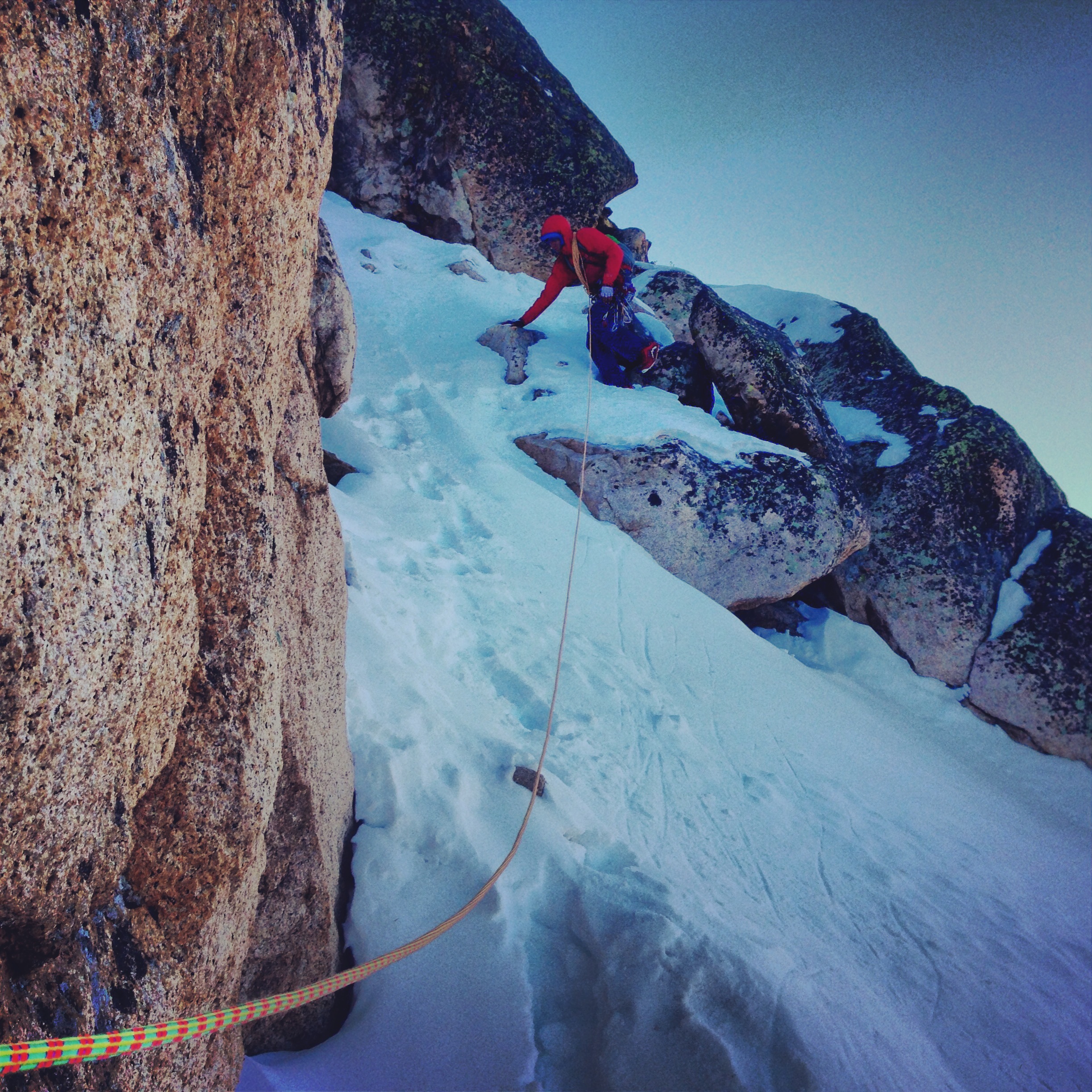 We chose our route. We planned to downclimb about 200 feet, cross a flatter snow slope, and then head up through rocky 4th class terrain. With a mix of slippery wet rock, powder snow, and ice, we short-roped and simul-climbed through the terrain, occasionally setting up a hip belay on steeper rock sections for added protection. With Andrew a little banged up both mentally and physically from leading the majority of the route the day before, I led the way through the maze of snow and rock. The sun’s rays were rapidly getting stronger, and climbing in all our layers, it was great to experience warmth again.
