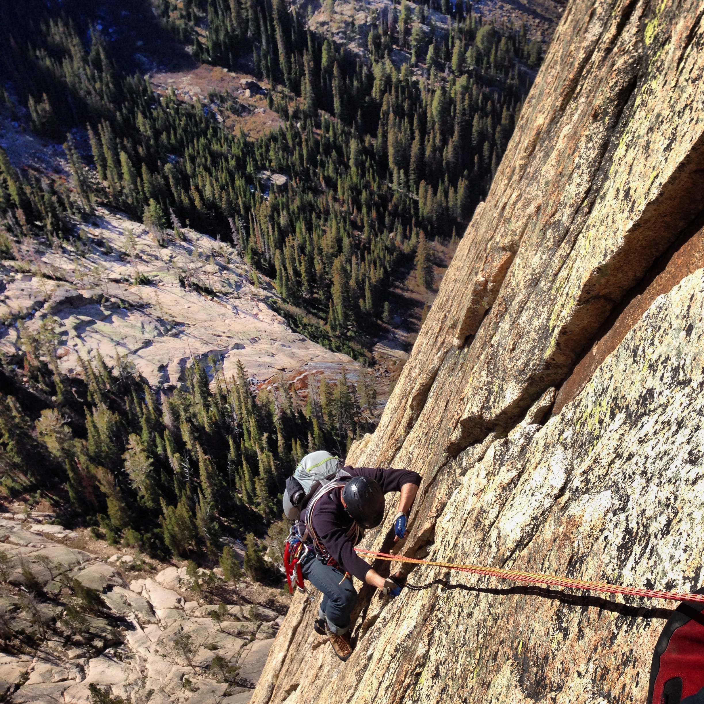 We ended up pitching it out only for about 7 pitches; the rest we short-roped or simul-climbed. There were several 5.6 sections, all of which protected nicely and have very fun moves with great exposure. Low fifth class and fourth class terrain connected the steeper pitches. There are great belay ledges the entire way, many with a large, safe horn or boulder to sling for a belay.