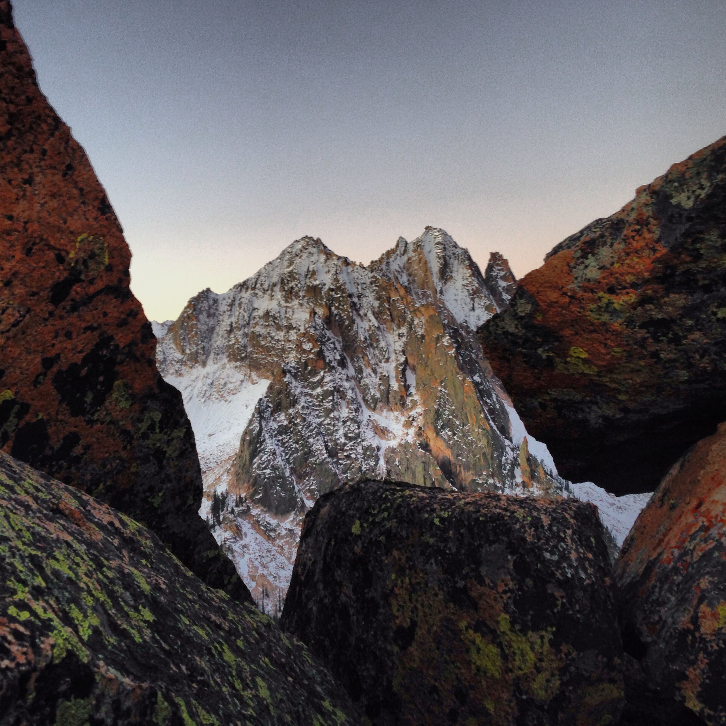 Bummed we won’t be climbing but enjoying the view and appreciating the fact that we didn’t have to wake up at 3, we laid our pads on the rocks (no, it wasn’t comfortable) and got into our sleeping bags as we prepared dinner, noticing the wind picking up and clouds moving in. As we went to sleep while it began to lightly snow, we joked about how exposed we were, with no tent, surrounded by snow and rocks, at 10,000′. We laughed and then tightened up our sleeping bags, going into mummy mode.